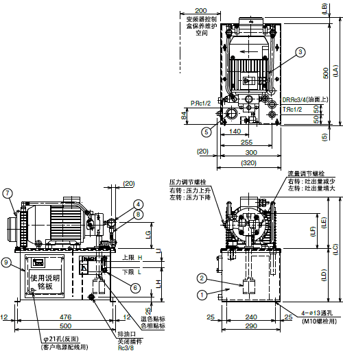 ■液压站P口(吐出口)及外部油路块(或传动装置)之间,请使用内径1/2英寸、最高使用压力14MPa、长度2m以上的软管进行配管。
